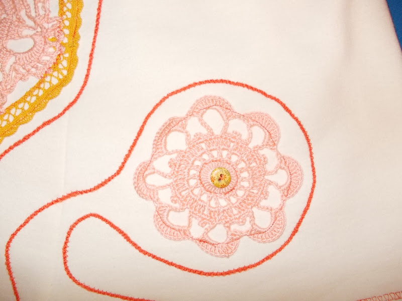 юбка и жилет из футера,апликации из вязаных салфеточек,хлопкового кружева,шерстянной пряжи,пришитой зиг-загом и деревянных пуговок.